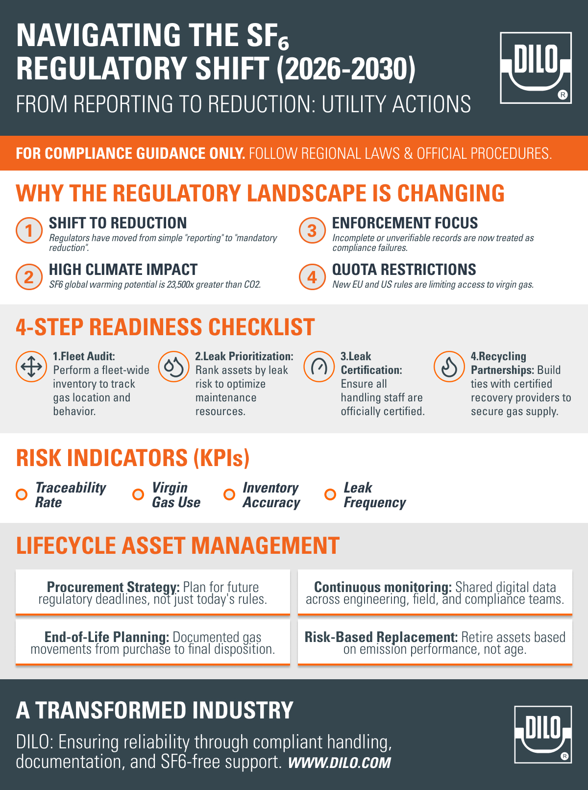 Review your fleet inventory, emissions tracking, and handling practices now to avoid compliance surprises later in the decade. If you’d like support evaluating your fleet inventory, emissions tracking, or gas-handling practices, contact DILO to speak with experts who work with utilities and operators navigating SF₆ compliance every day.